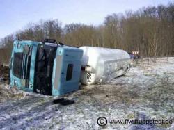 Nach einem Eisregen kam in der Zaunröder "Friedhofskurve" ein Silozug von der Fahrbahn ab und kippte um. Die Anfahrt zur Einsatzstelle bei spiegelglatter Fahrbahn mussete sehr langsam erfolgen. Beim Eintreffen der Einsatzkräfte, lag der verunfallte LKW auf der Fahrerseite liegend auf dem Feld. Der Fahrer war mit Hilfe eines Ersthelfers aus dem Fahrzeug befreit und stand verletzt auf dem Fahrerhaus.